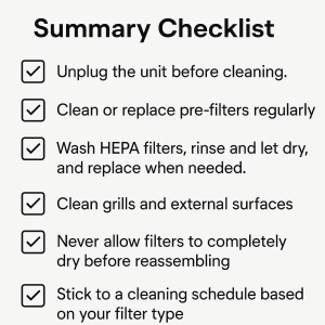 | Pre-filters | Clean or wash regularly to reduce load on HEPA filter |
